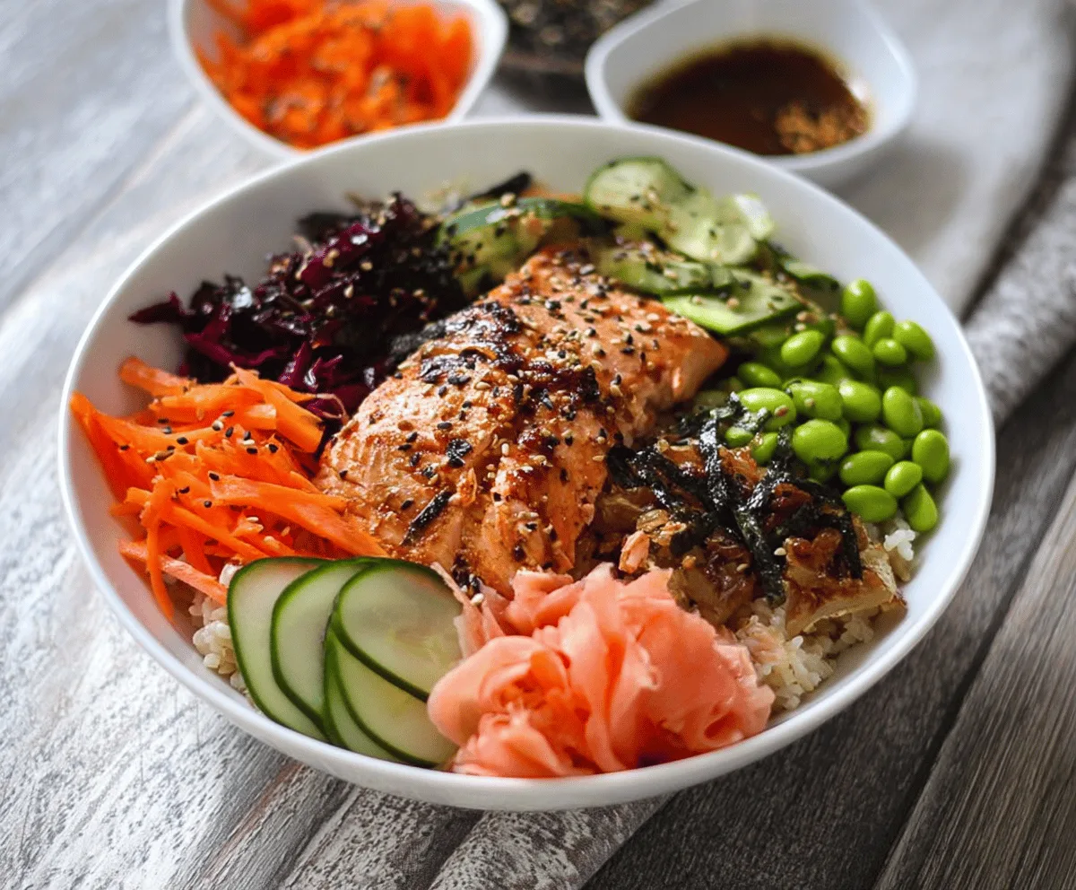 Start with a base of the seasoned sushi rice in your bowl. Place the baked salmon in the center, and then add neat piles of shredded carrots, purple cabbage, cucumber slices, edamame, and a small mound of pickled ginger around it. Garnish with thin strips of nori and a sprinkle of sesame seeds. Serve with extra soy sauce or your favorite sauce on the side.