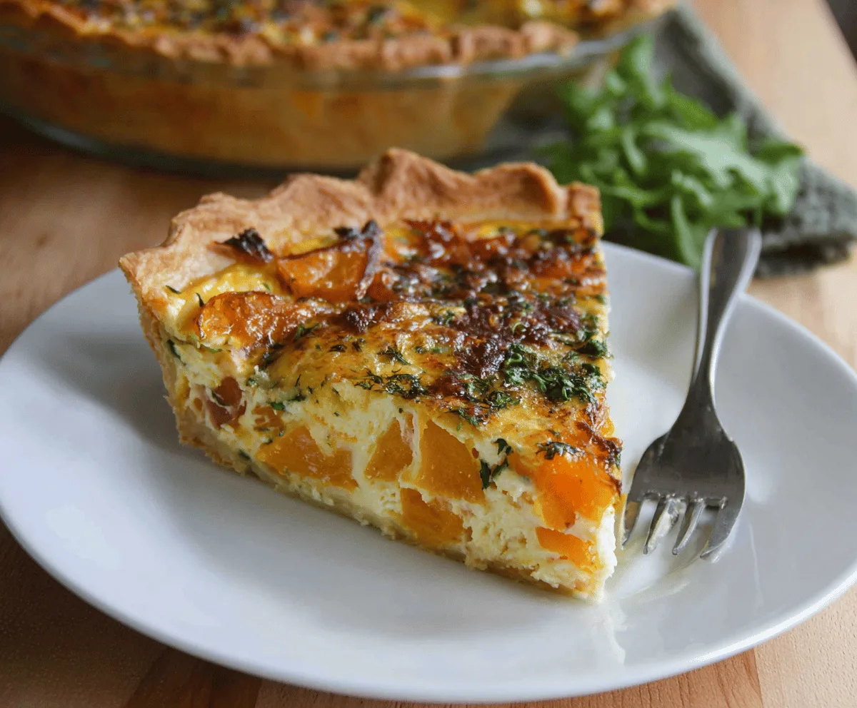 Spread the roasted butternut squash evenly over the cheese layer. Pour the egg mixture over the squash carefully. Bake the quiche at 350°F (175°C) for 35-45 minutes. The filling should be set and the top golden brown. Let it cool for 10-15 minutes before slicing. Garnish with fresh parsley or chives if you like. Serve warm or room temperature and enjoy!