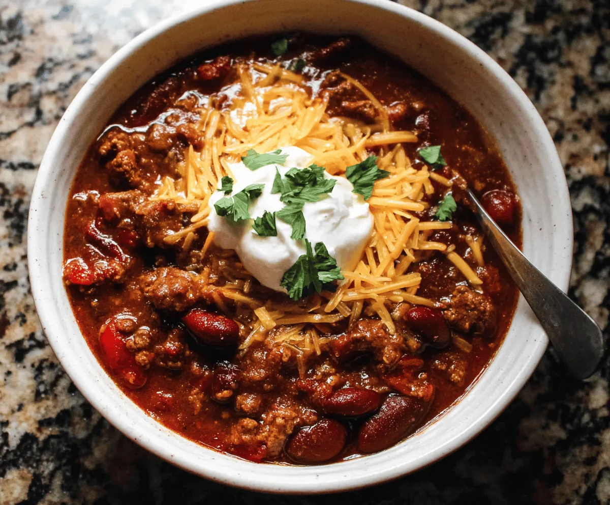 Before serving, give your chili a taste and adjust salt or spice if needed. Then, ladle the chili into bowls and top with shredded cheddar cheese, a dollop of sour cream, and sprinkle some fresh cilantro on top if you like. Enjoy the warm, comforting flavors!