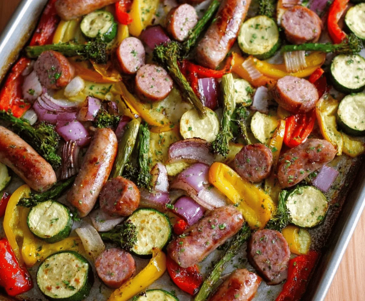 I love making this dish on busy weeknights when I want something satisfying but easy to prepare. Tossing everything on a sheet pan means less cleanup, and it’s really flexible—you can use your favorite sausage and whatever veggies you have on hand. I usually add a little olive oil, salt, pepper, and some herbs, then pop it all in the oven. It’s a simple way to get a balanced meal on the table with minimal fuss and maximum flavor.