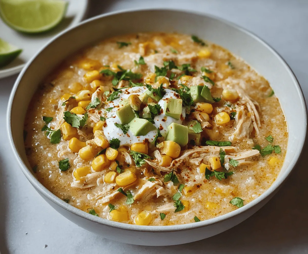 Enjoy your comforting, creamy Mexican Street Corn White Chicken Chili!