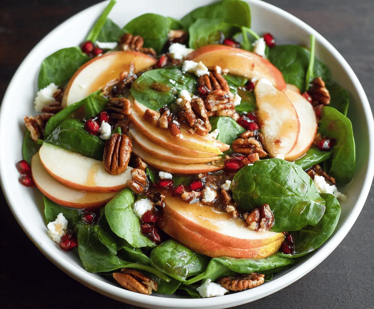 In a large salad bowl, add the spinach leaves, thinly sliced pear, toasted pecans, crumbled goat cheese, and pomegranate seeds. Drizzle the dressing over the salad and gently toss everything together to coat evenly.
