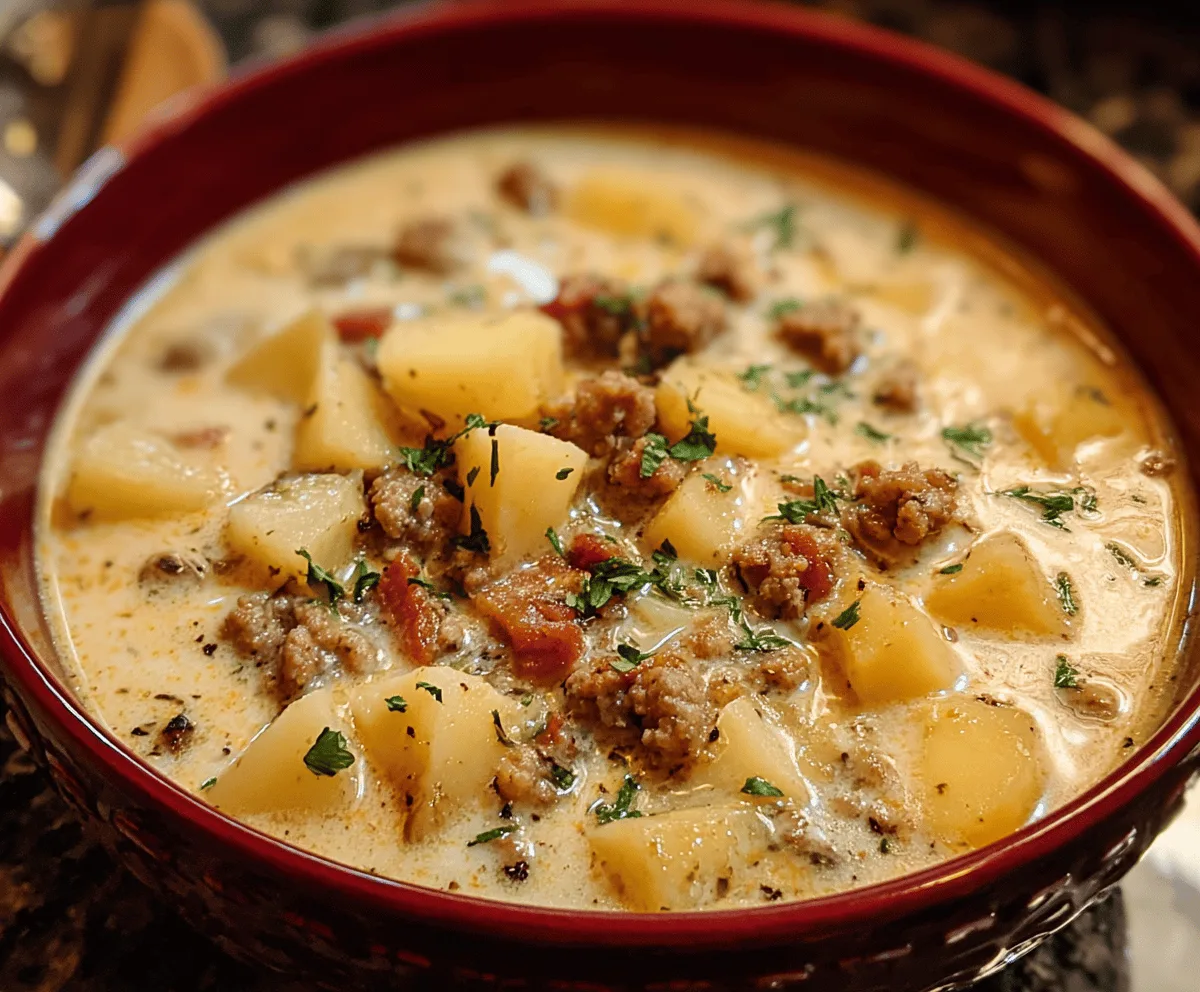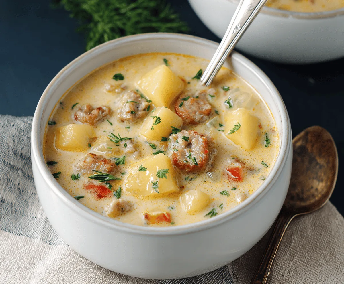 This chowder takes about 10 minutes to prepare and around 25 minutes to cook. You’ll spend some time browning the sausage and simmering the potatoes until tender, making it a cozy meal that comes together in about 35 minutes total.