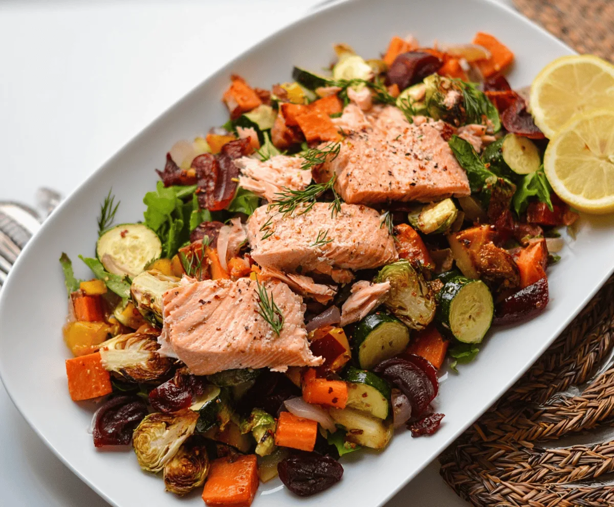 This Roasted Vegetable and Salmon Salad is a lovely mix of tender, flavorful roasted veggies and flaky, perfectly cooked salmon. The vegetables bring a warm, slightly sweet touch, while the salmon adds a bit of richness and protein. Together, they create a salad that’s both fresh and filling without feeling heavy.