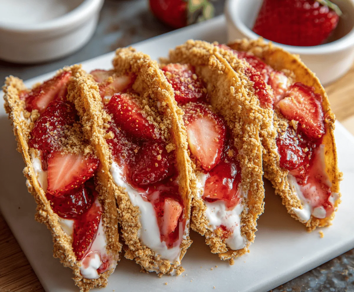Enjoy your creamy, crunchy Strawberry Crunch Cheesecake Tacos – a fresh and fun dessert everyone will love!