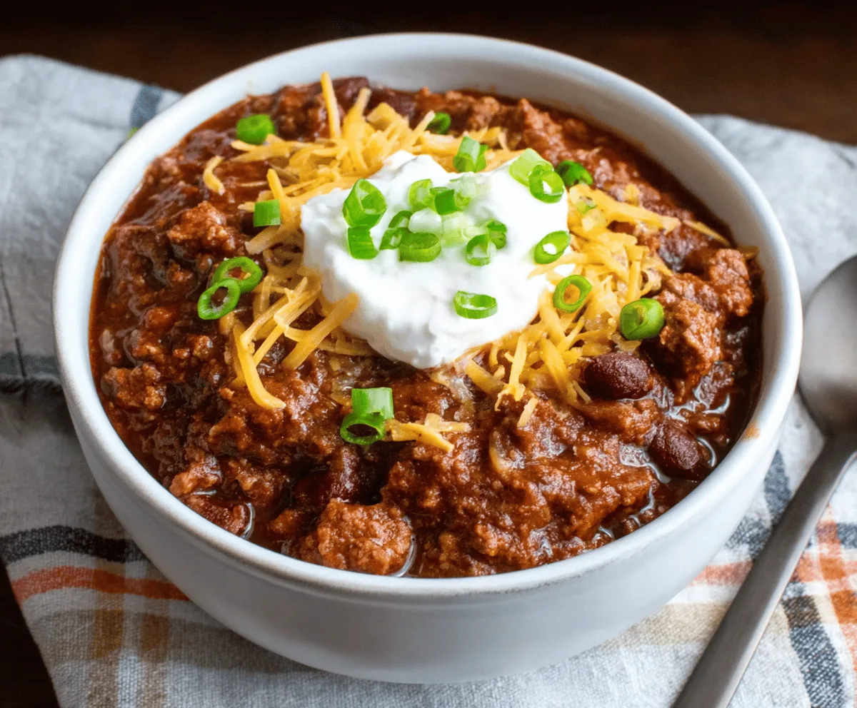 Give the chili a taste and adjust seasonings if needed — add more salt, chili powder, or cayenne if you like more heat. Serve the chili hot with your favorite toppings like shredded cheddar cheese, sour cream, and chopped green onions. Don’t forget some crunchy tortilla chips on the side for an extra treat!