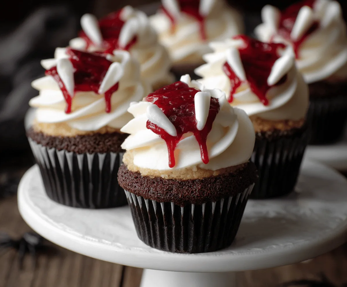 Vampire Bite Halloween Cupcakes are a fun treat that brings a little spooky fun to your Halloween party! These cupcakes usually come with a rich chocolate base and a creamy frosting, topped with a little “bite” mark made with red icing or jam to look like vampire bites. They’re cute and a bit cheeky, perfect for celebrating the holiday with a tasty twist.