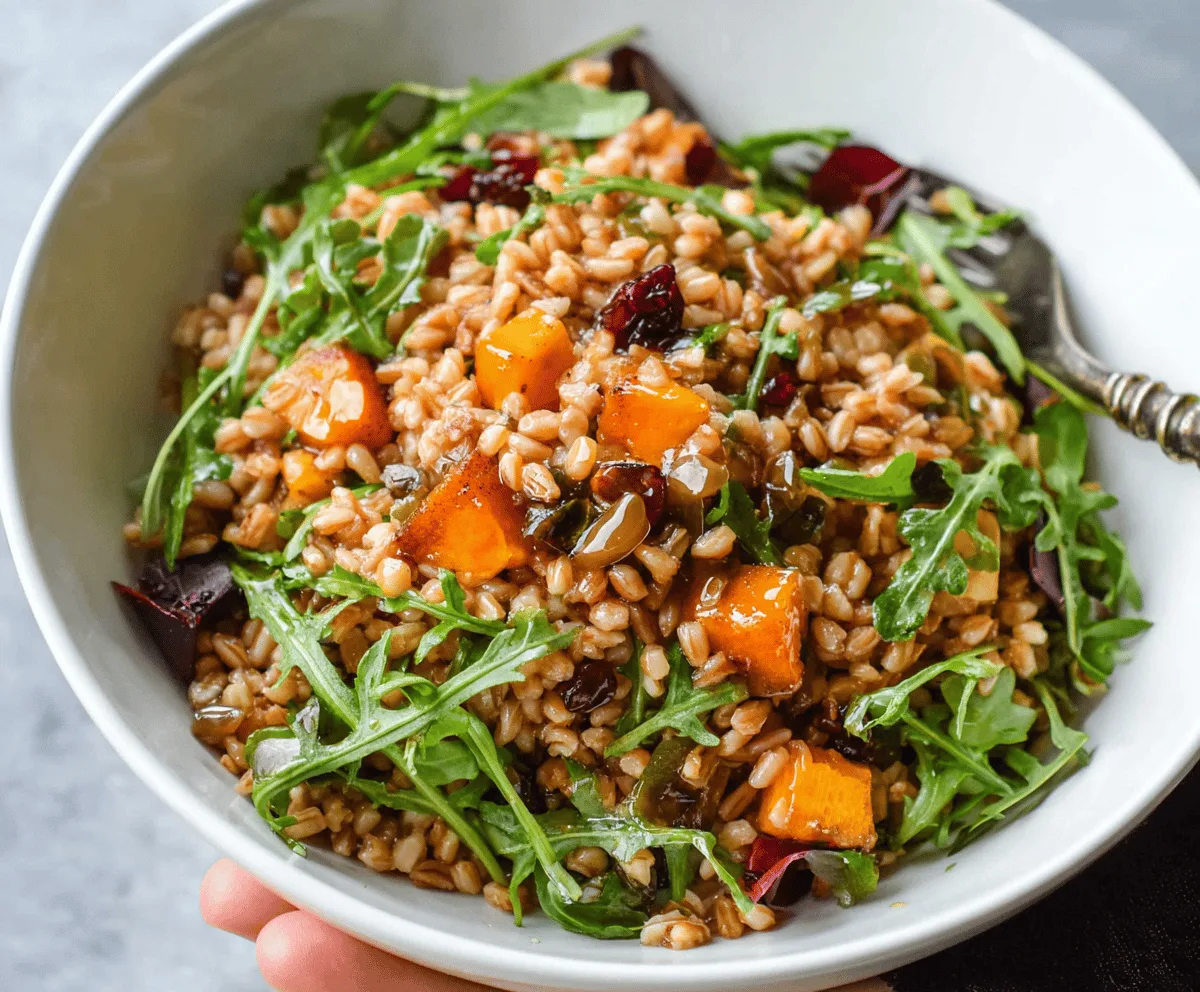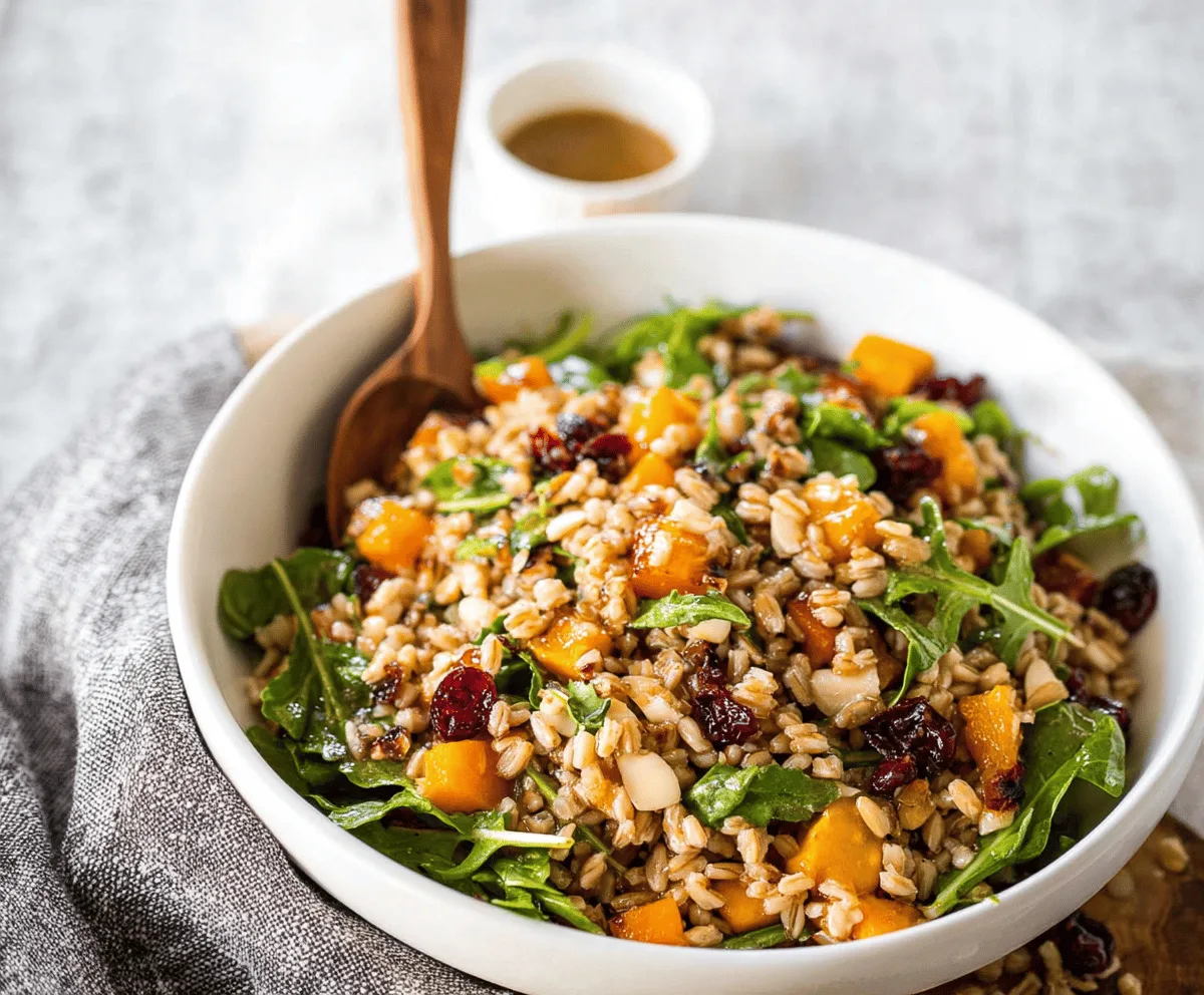 In a large bowl, combine the warm cooked farro, roasted butternut squash, fresh arugula (or baby spinach), dried cranberries, and toasted nuts. Toss gently so everything mixes well.