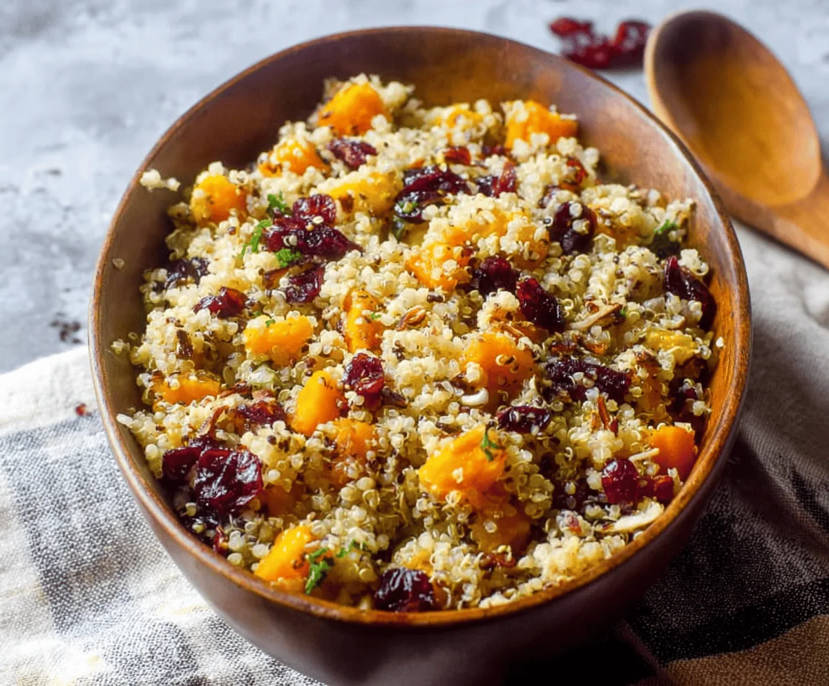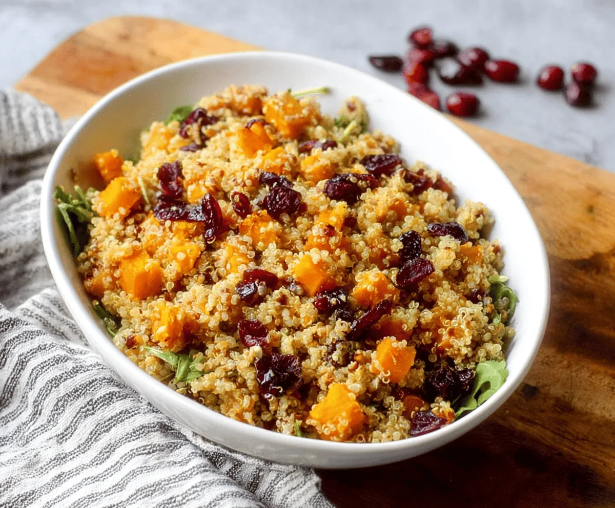 This Butternut Squash and Cranberry Quinoa Salad is a bright and cheerful mix of sweet roasted butternut squash, tangy dried cranberries, and fluffy quinoa. It’s colorful and packed with textures that keep every bite interesting, from soft squash to chewy cranberries and crunchy nuts if you want to add them. The flavors balance out nicely, making it a refreshing but filling dish.